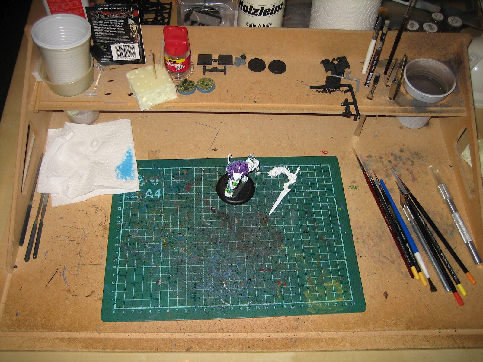 Hier enkele foto's van mijn werktafel op dit moment. Ik ben bezig aan een Warpwolf Stalker ( zie foto's ).
